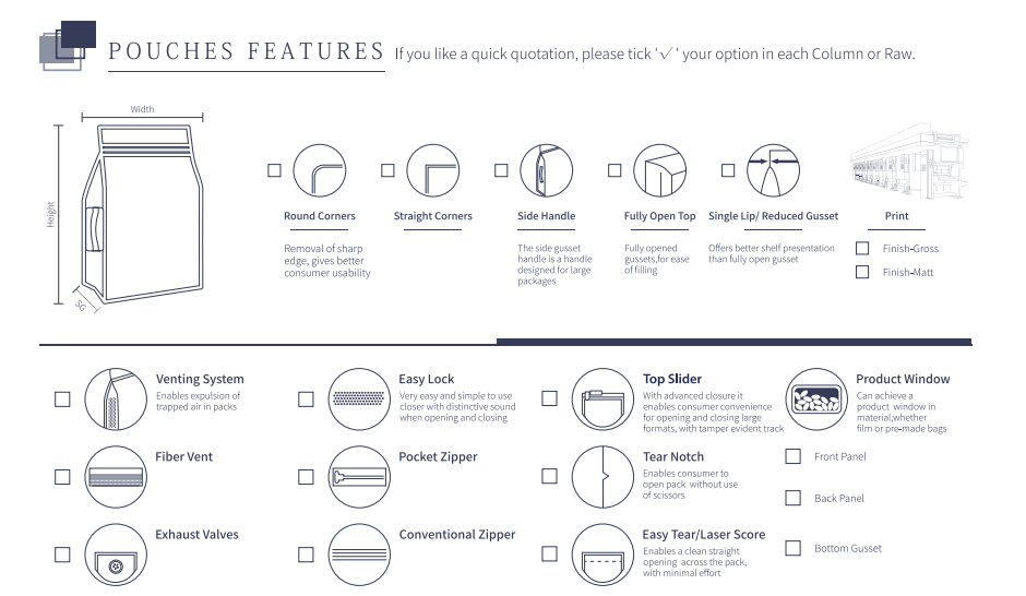 Proporcionar una excelente presentación en el estante y un almacenamiento conveniente con nuestras bolsas de sello cuádruple.