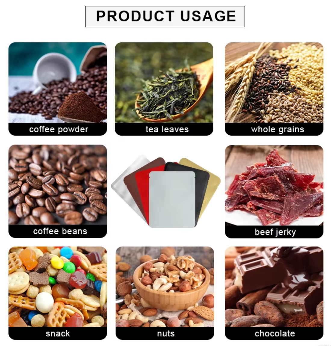 Solicitud: | Embalaje de comida seca; Embalaje de alimentos congelados; Embalaje de alimentos para mascotas; Paquete de té y café; Sal de sal, azúcar y especias; Embalaje de arroz; Embalaje de chocolate y dulces; Embalaje cosmético de mascara de hoja facial; Embalaje de tabaco y cigarrillos |