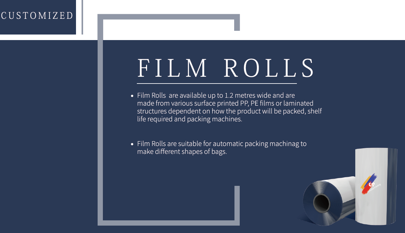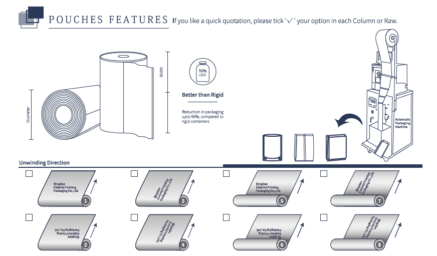 Roll Film es una excelente opción de empaque para productos de una sola porción o porción pequeña, paquetes de muestras, bolsas de vacío de alimentos y productos con formas planas o flexibles. Es rentable y amigable con el consumidor. Perfecto para alimentos, café, té, bocadillos, alimentos secos, golosinas para mascotas, granos, polvo, alimentos para mascotas, productos agrícolas y más, estas bolsas aseguran que sus productos permanezcan frescos y protegidos.