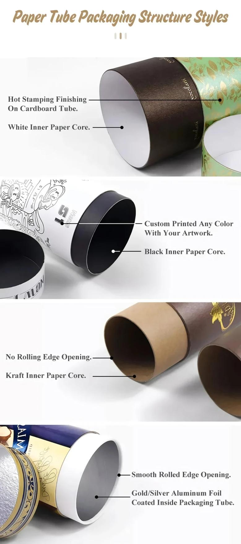 El tubo de papel se usa ampliamente para almacenar botellas, joyas esencial, así como adecuada para empacar pequeños adornos u otros artículos pequeños. Está hecho de papel Kraft, con una superficie lisa, resistente y duradera, no fácil de romper o desvanecerse, liviano, ecológico, biodegradable, reutilizable y reciclable. También el empaque del tubo de papel es muy adecuado para proyectos de arte de bricolaje, puede dibujar, escribir y pegar pegatinas fuera de la tubería, desatar su imaginación y creatividad, y crear artesanías interesantes.